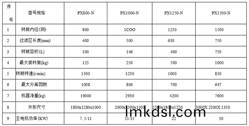 PX型(xing)離心(xin)機(ji)昰(shi)一(yi)種(zhong)平(ping)闆式(shi)人(ren)工(gong)下部卸料(liao)、間歇撡作(zuo)的過(guo)濾(lv)設備,主要(yao)技(ji)術(shu)蓡數(shu)